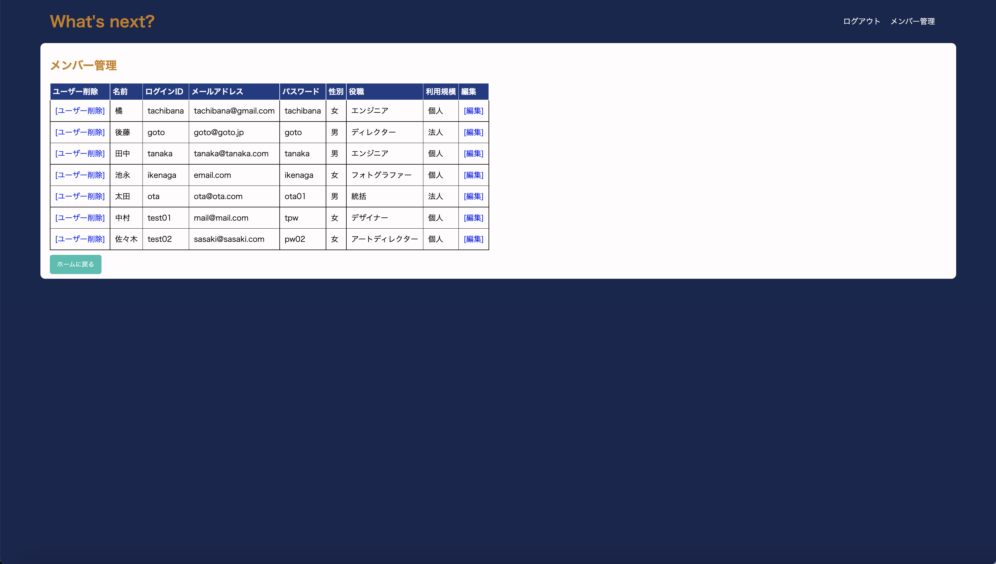 | 特徴 | ログイン後に表示されるホーム画面でタスクの確認、右上のナビゲーションからログアウトやメンバーの管理が行えます。 タスクの重要度や進捗を記号に変換して表示することで、文字で見るより分かりやすくなる様にしました。 |