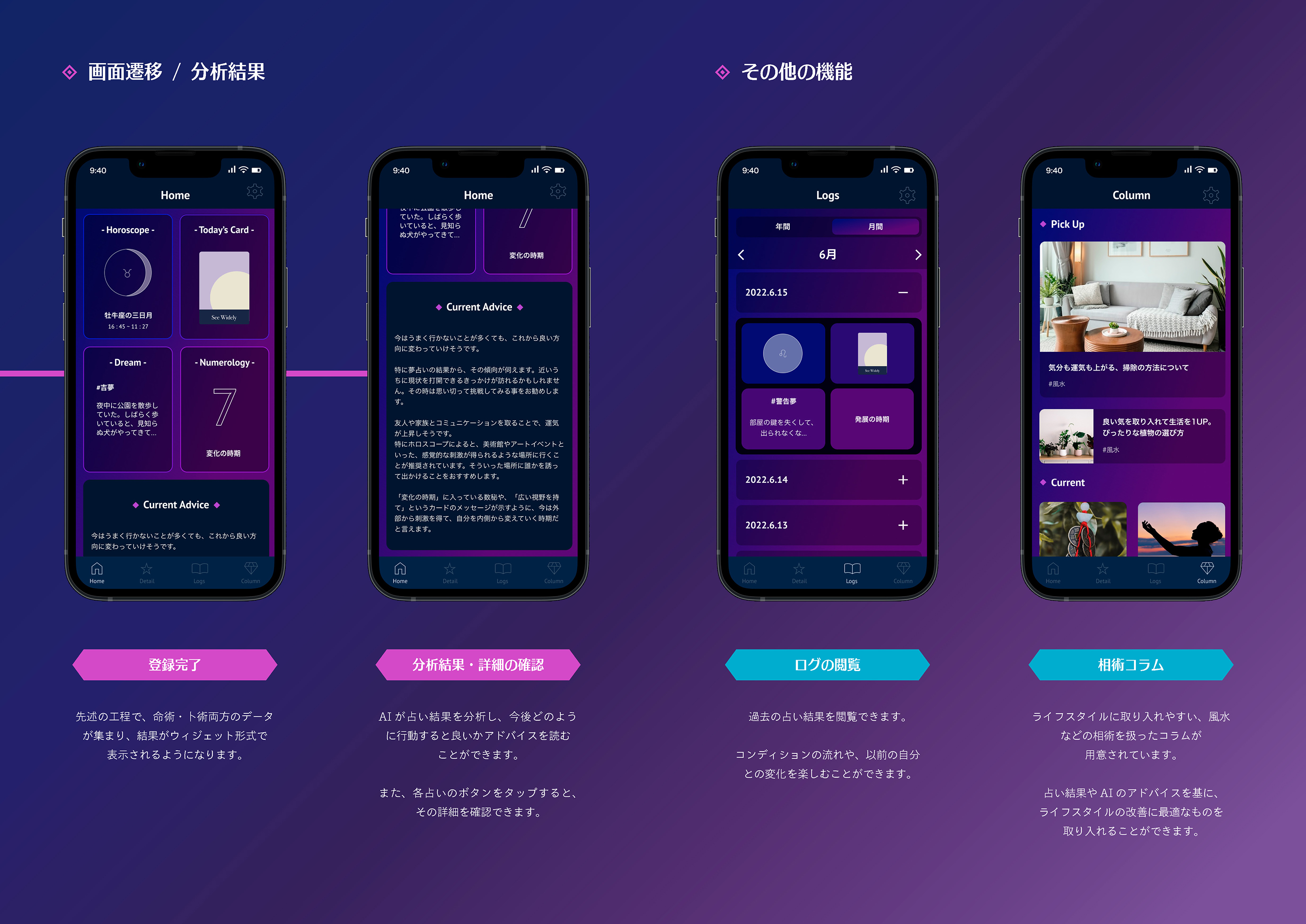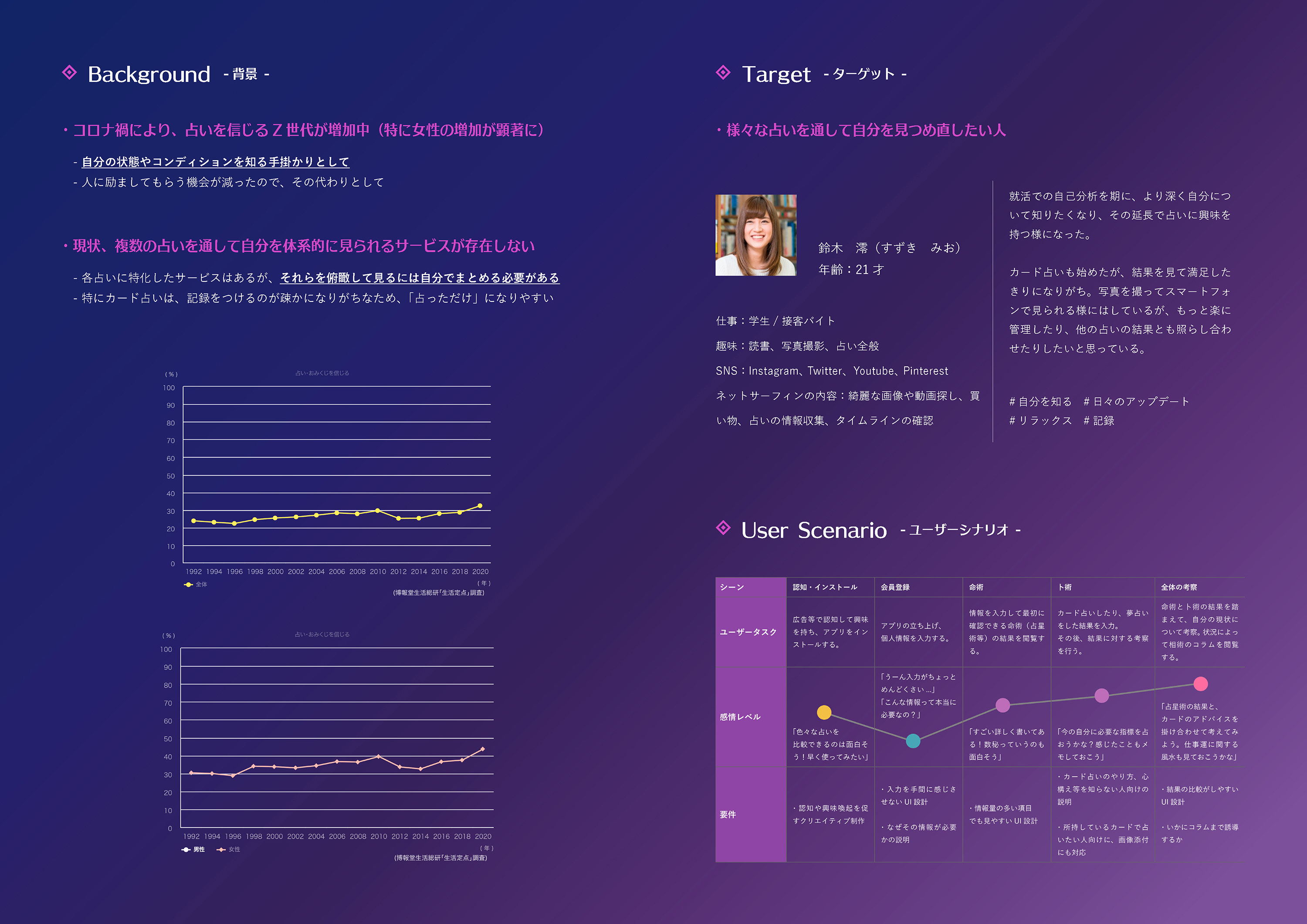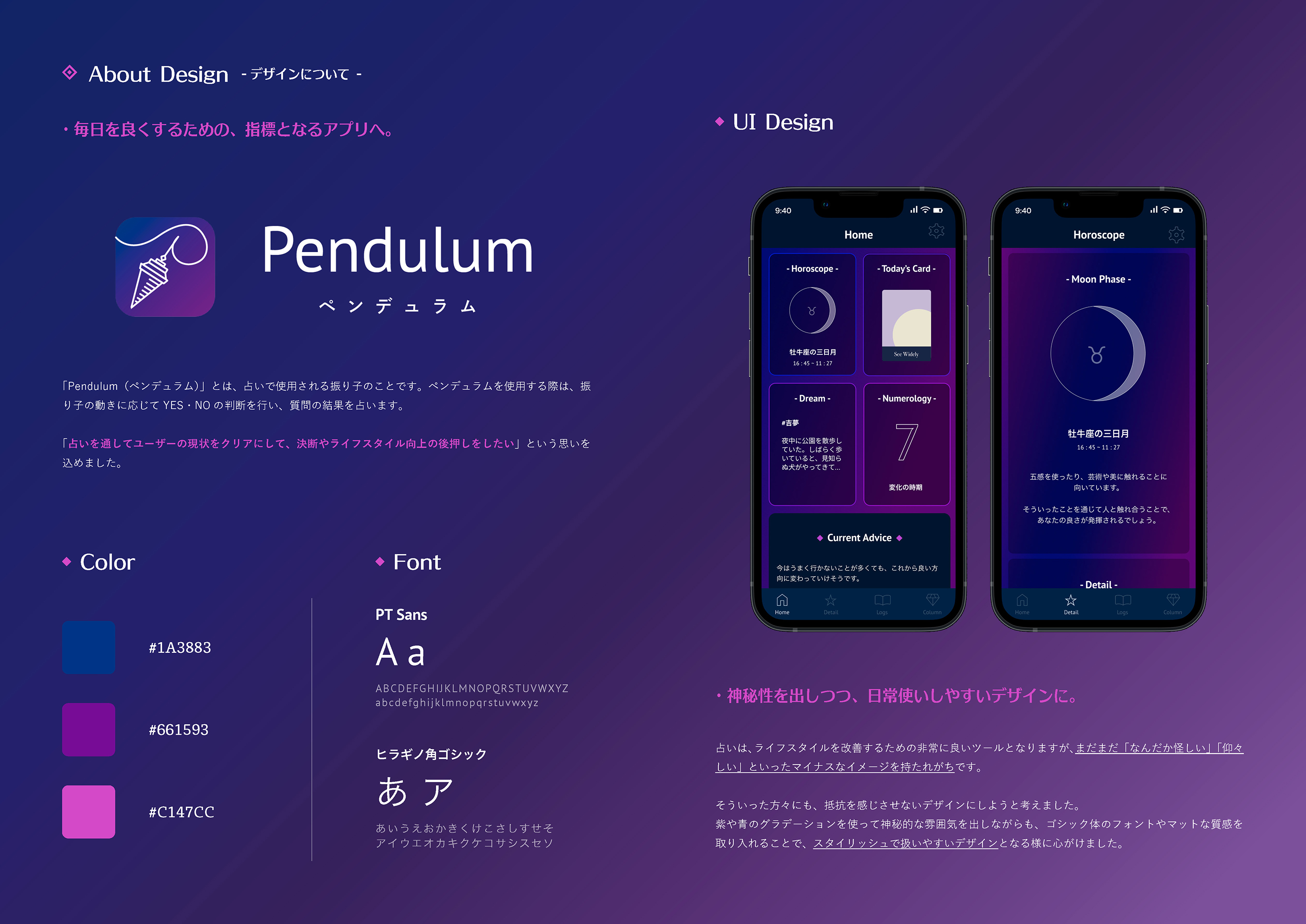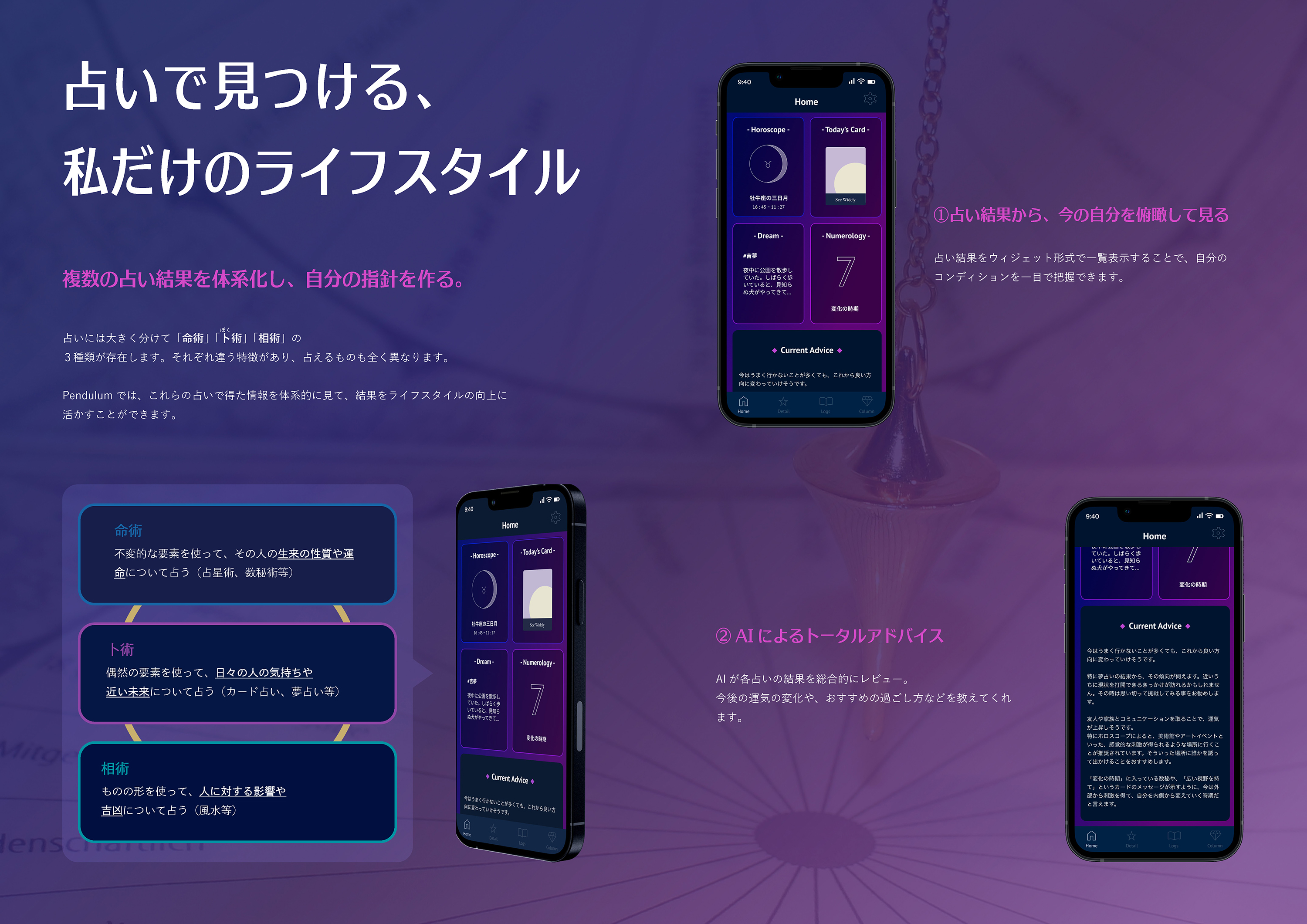 | 概要 | 占いで自分を体系的に見られるアプリ『Pendulum』の企画を考えました。 |